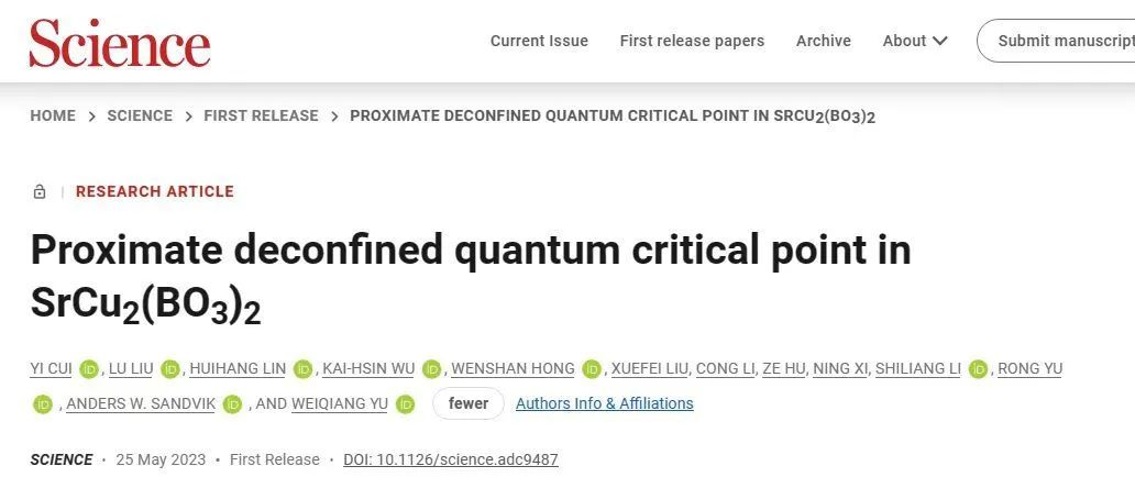 近日,北京麻豆精品秘 国产传媒物理学院刘录助理教授与中国人民大学理学院物理学系于伟强课题组和俞榕课题组、美国波士顿大学 Anders W. Sandvik 课题组、中国科学院物理研究所李世亮课题组等合作在《科学》杂志上发表论文“Proximate deconfined quantum critical point in SrCu2(BO3)2”。他们在一种准二维阻挫量子磁性材料中,借助高压、强磁场、极低温的调控和核磁共振谱学测试,发现了一种超越朗道相变理论范式的新型量子相变现象,即解禁闭量子临界,并首次给出了解禁闭量子临界点附近量子临界行为的确凿实验证据。