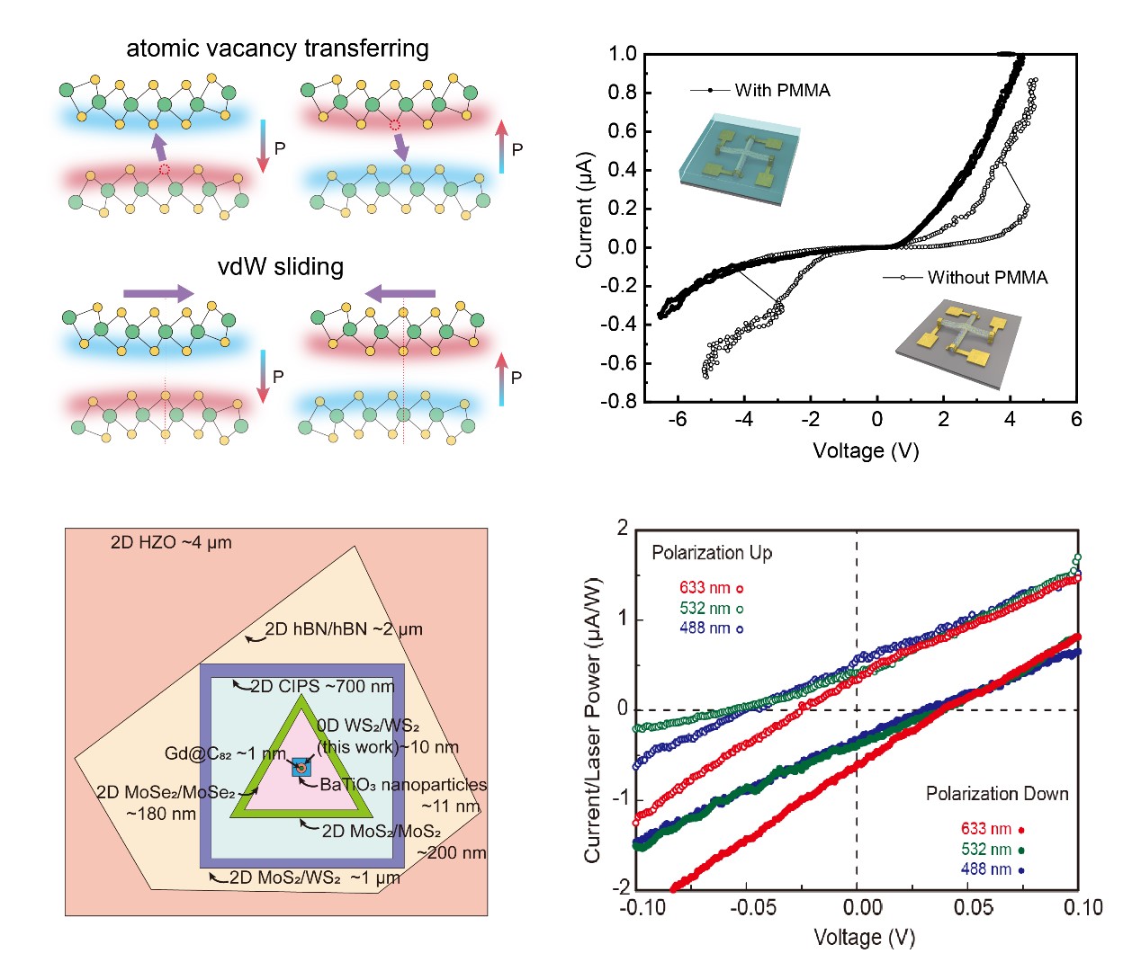 铁电效应是一百年前由Joseph Valasek发现的重要物理现象。传统的铁电效应受到尺寸效应限制——当铁电材料的尺寸缩减到一定程度时,退极化场的显著影响会导致铁电材料失去极化。这一尺寸效应极大地限制了铁电材料在高密度存储器件中的应用。近年来,一种不依赖于离子晶格变化,而由范德华界面滑移产生的铁电效应引起了广泛关注。然而,以往滑移铁电效应的研究主要集中在二维和三维材料体系,滑移铁电效应的进一步尺寸缩减是整个铁电效应研究框架的重要拼图。对此郭耀课题组在原有滑移铁电效应工作的基础上,利用纳米管构建零维的范德华界面和器件,并观察到铁电二极管的阻变和回滞现象。通过进一步的实验和理论计算验证,该铁电二极管的电学行为是由于零维范德华界面的晶格滑移所产生,使得器件能够产生可用于信息存储的阻值变化,并可以在几乎整个可见光波长范围内产生可编程的光伏响应。
