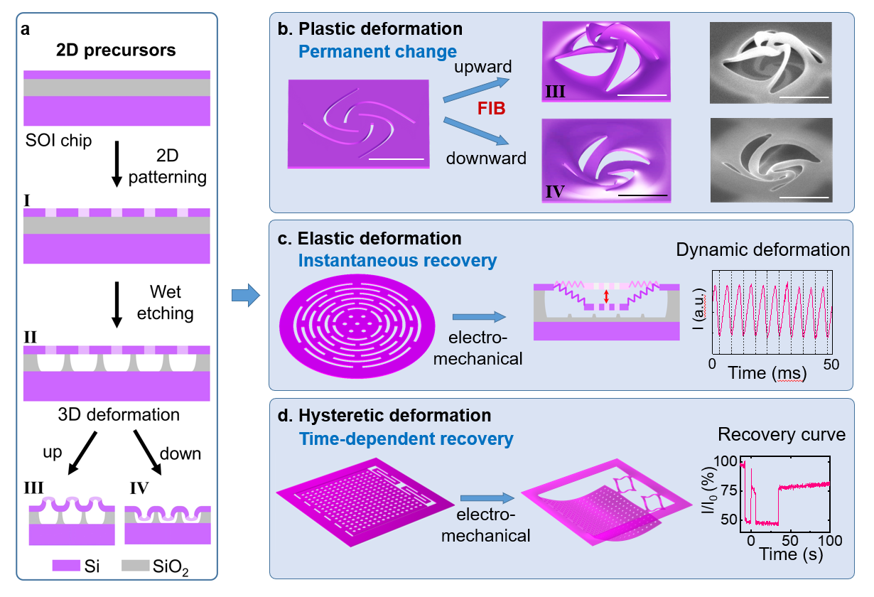 硅基纳米剪纸技术的突破具有重要的里程碑意义。这是因为绝缘体上硅(SOI)是当代集成光电子领域最重要的半导体材料之一,具有优异的CMOS工艺兼容性和成熟的产业化优势。研究团队自2019年开始将硅基纳米剪纸技术作为重点攻关方向,经过多年摸索成功掌握了微纳尺度硅材料的各类形变制造及调控方法(图1),突破了纳米剪纸结构在金属材料方面的性能限制,实现了具有多样化形变能力的新型微纳结构(图2)。
