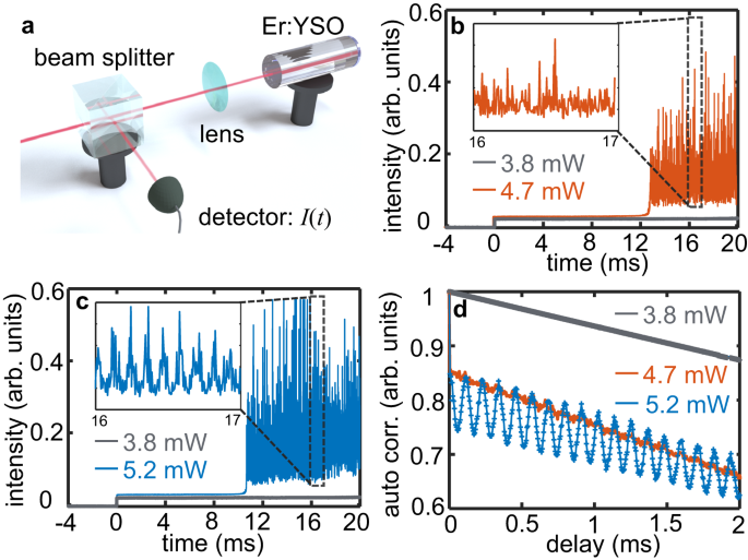 基于上述理论的指导,我们在实验中使用了激光驱动下的掺铒离子晶体材料为平台,通过利用铒离子之间的多体相互作用,不仅实现了连续时间平移的自发破缺,还观察到时间上周期性有序结构的自发形成。与此前时间晶体的实验结果相比,最显著的特点就是我们实验上观察到的时间上的周期性行为完全是系统内部的自发行为,而不是在外界周期性约束的影响下发生的。这是国际上首次在一个常规晶体中实现材料本身所固有的时间晶体物质相,证明了时间晶体的时间对称性破缺不需要类似于周期性驱动或者是谐振腔调制等外部机制的诱导而发生。