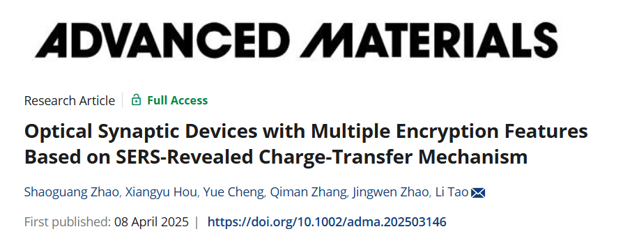 近日,北京麻豆精品秘 国产传媒物理学院姚裕贵教授团队成员陶立教授课题组在Advanced Materials发表了一项重要研究成果,题为“Optical synaptic devices with multiple encryption features based on SERS-revealed charge-transfer mechanism”。具有原子级厚度的二维材料光学突触器件表现出构建高度集成的可调谐人工视觉神经网络的潜力。然而,原子级厚度也会导致光吸收较弱,限制了器件的光电性能。该研究提出的罗丹明6G染料(R6G)/InSe杂化结构器件展现了优异的光响应及光电突触性质,并从光谱学和光电子器件两种视角,证明了染料分子和二维InSe之间的电荷转移机制。通过表面处理有效调控了电荷转移的过程,并基于此实现了双重光学加密防伪应用。