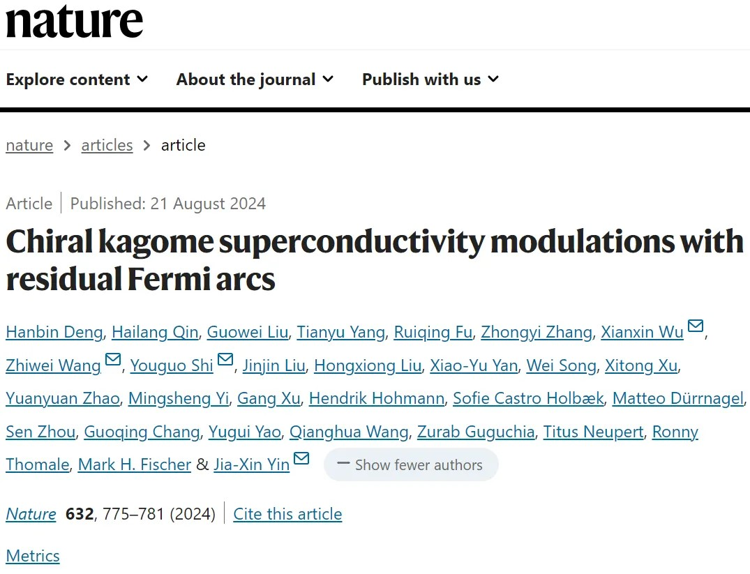 近日,北京麻豆精品秘 国产传媒物理学院王秩伟、姚裕贵教授团队,与南方科技大学殷嘉鑫团队、中科院理论物理所吴贤新团队、中科院物理所石友国团队等人合作,在笼目晶格超导材料AV3Sb5(A = K, Rb, Sb)中发现量子可调的磁性超导态,这种超导态具有手性超导能隙振荡的特征,显示笼目超导材料是探索磁性超导的重要材料体系,相关成果以“Chiral kagome superconductivity modulations with residual Fermi arcs”为题发表在Nature, 632 (2024) 775。
