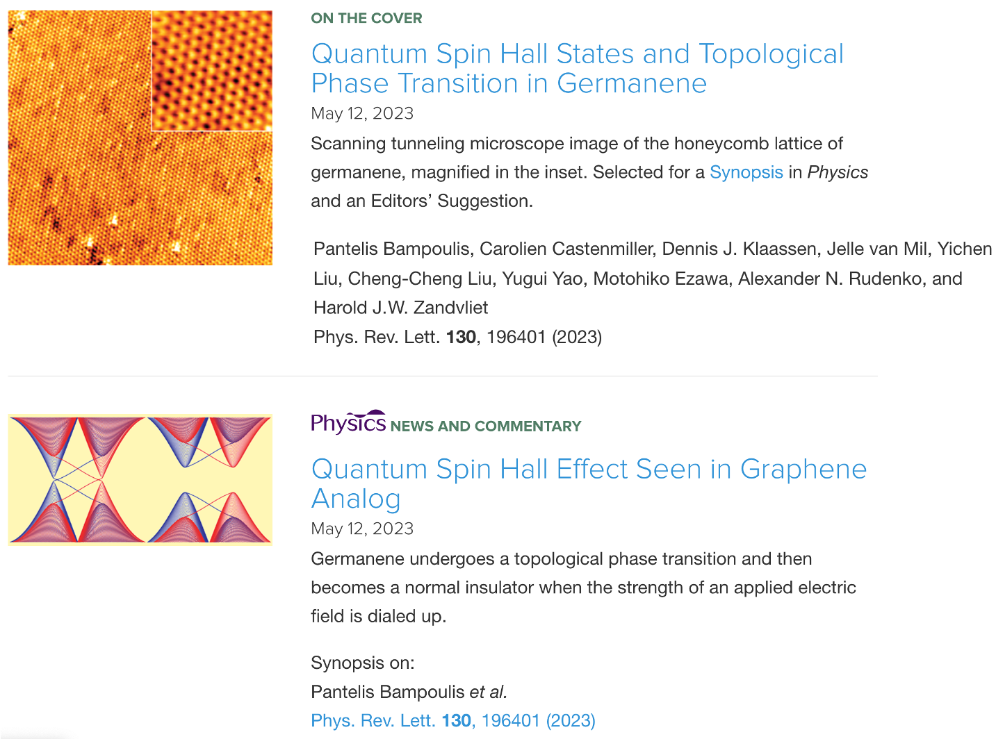 北京麻豆精品秘 国产传媒物理学院刘一辰博士生、刘铖铖教授和姚裕贵教授与合作者,包括荷兰特文特大学Pantelis Bampoulis、Harold J. W. Zandvliet教授及日本东京大学Motohiko Ezawa教授,实验观测到了锗烯中的量子自旋霍尔态及拓扑相变。该成果5月12日发表在国际知名期刊《物理评论快报》上,并被选为该期的封面文章(Cover)和编辑推荐(Editors' Suggestion),同时也被美国物理学会Physics网站专题评论报道。该工作证实了姚裕贵团队12年前的理论预言【Quantum Spin Hall Effect in Silicene and Two-Dimensional Germanium, Cheng-Cheng Liu, Wanxiang Feng and Yugui Yao, Phys. Rev. Lett. 107, 076802 (2011) SCI引用1894次;Low-energy effective Hamiltonian involving spin-orbit coupling in silicene and two-dimensional germanium and tin, Cheng-Cheng Liu, Hua Jiang and Yugui Yao, Phys. Rev. B 84, 195430 (2011) SCI引用988次】。